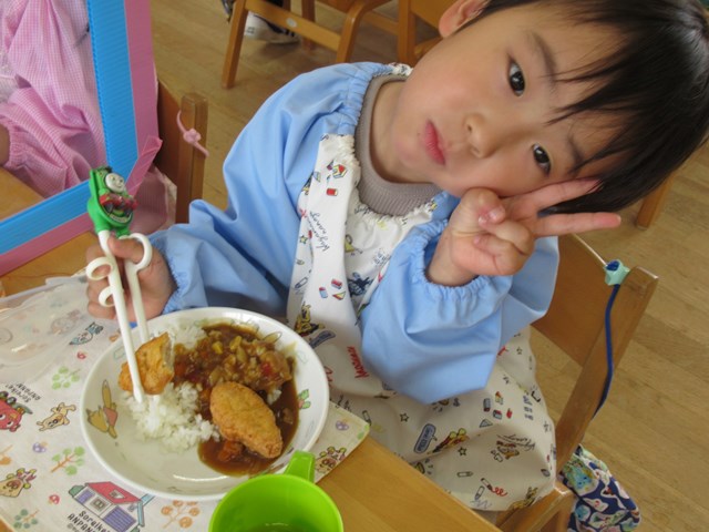 3日目からは、給食が始まり、大好きな「特製わかばカレー」。♡の形の人参を見つけると、「あ、みつけた!!」思わずにっこり😊