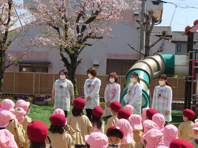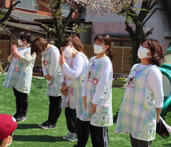 4月8日の進級式は、桜の花びらがみんなの門出をお祝いしてくれていたね。まさこ先生、さやか先生、みお先生、みらい先生、りか先生、ちはる先生の6人がみんなの前で紹介され、ちょっぴり緊張気味に「よろしくおねがいします。」とご挨拶。すると・・・