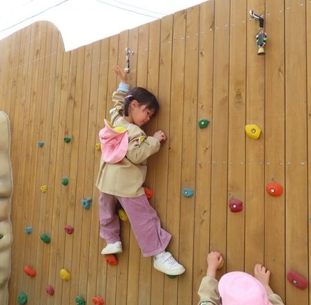 さあ、すぐに外遊びが始まったよ!年中組になったばかりのみんなは、ボルダリングとうんていに果敢に挑戦していたね。