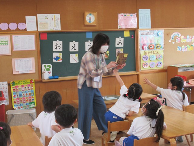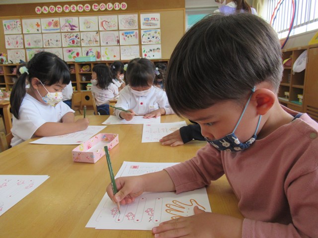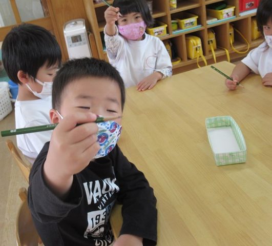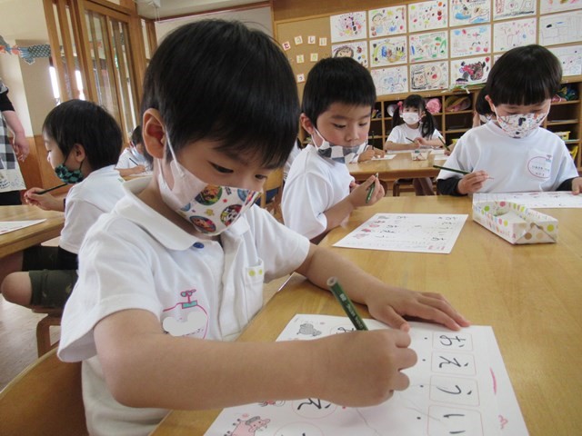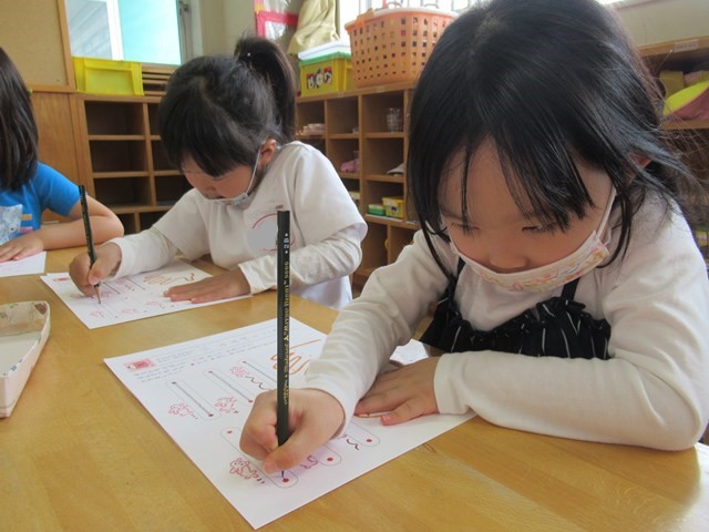鉛筆の持ち方も、一人ひとり丁寧に教えてもらいばっちり!!これからも、まなびタイムを通して、正しい持ち方を身につけていこうね。
