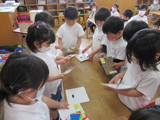 虫探しから帰ってきてからは、幼稚園のあっちこっちに置いてある色んな図鑑や生き物ポスターを、一生懸命に見ていたみんな。