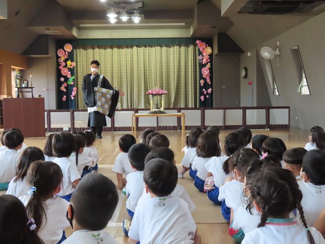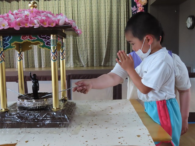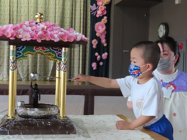 園長先生が、花祭りの由来やお釈迦様が教えてくれたことをお話ししてくださいました。お釈迦様が生まれた日、世界中が喜んで世界中のお花が咲き、ドラゴンがお空に9匹現れたお話を目を輝かせて聞いていた子ども達。