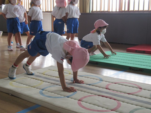 やる気満々で、マットや跳び箱、鉄棒に挑戦していく姿をたくましく感じた私たちです。