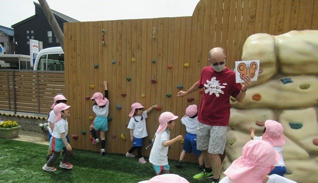 クリス先生の英会話の時間は、出来るだけマスクを外せる環境で英語を学んでほしいとの思いから、園庭をいっぱいに使って英語でゲームをして遊んだね。