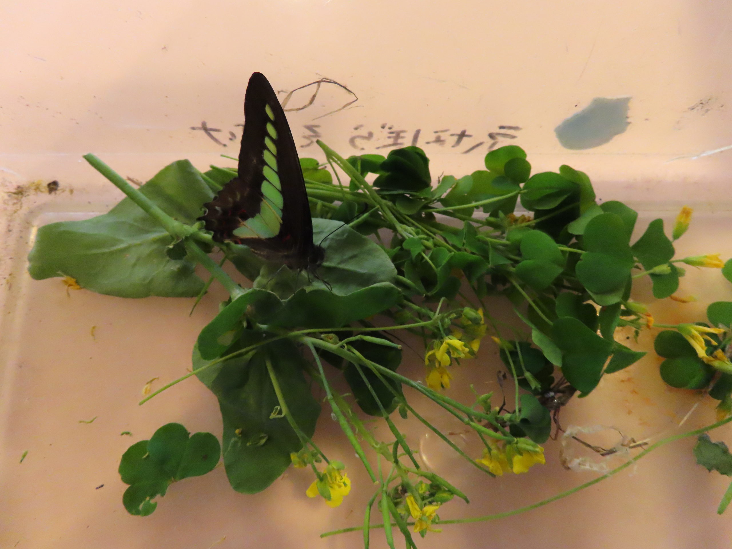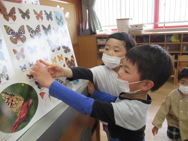 この頃、年長組さんでは、普段見られないような美しいチョウチョや、とても珍しい幼虫をお家で捕まえて「幼稚園のみんなに見せてあげたいから。」と、みんなの生き物コーナーに置いていってくれる姿がたくさん見られるようになりました。