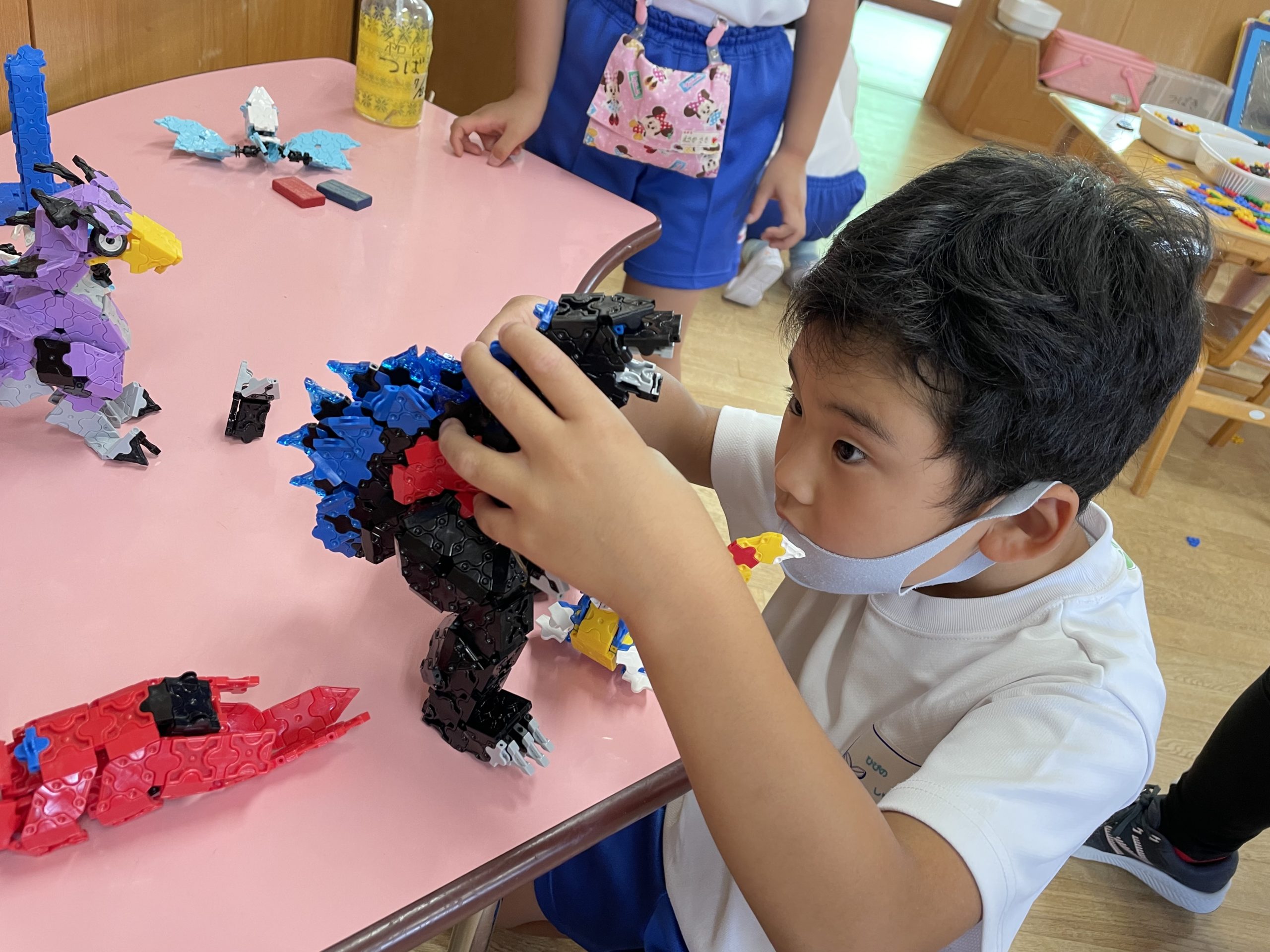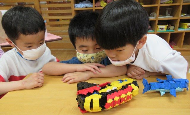 パチパチとはめていくときの気持ちの良い感覚を味わいながら、少しずつ少しずつ自分たちでアイデアを出し合いながら創作を楽しめるといいなと思い、見守っています。