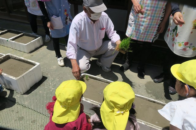 事前に、絵本を読んでもらったり、廊下に並べられた図鑑を自分たちでみたりして、稲の苗植えを楽しみに待っていた子ども達。「お米が出来たら食べられるの?」「ご飯になるの?」と興味津々で待っていたね。