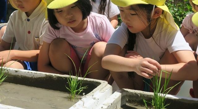 お米ってこんな小さな稲から出来るんだね・・・と不思議な気持ちで、稲の苗を植えた子ども達。