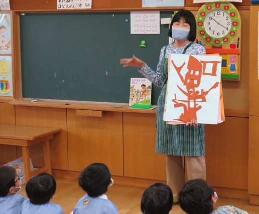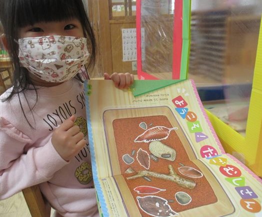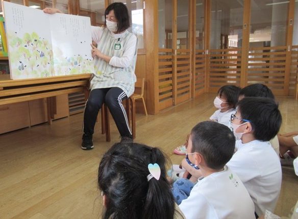 年長のお部屋の棚の上には、先生たちが「子ども達に読んであげたいな😊」と思う絵本が、ずらりと並んでいます。毎日時間を見つけて先生が読むお話を、目を輝かせながら興味津々で聴いていたみんな。