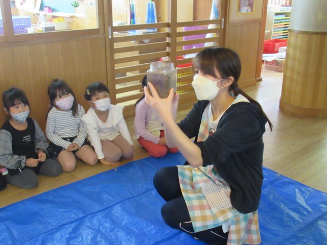 園長先生が「赤ちゃんイモリのお腹がオレンジ色になっていたら、ちゃんと食べた証拠だよ。」と教えてくださったので、じっと観察していたみんな。しばらくすると、「食べてる、食べてる!」と大喜び。