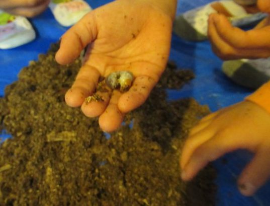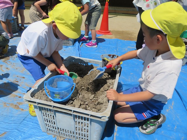 5月になると、卒園したお兄さんたちから引き継いで、それぞれのクラスで育てているクワガタの幼虫の土を、みんなで入れ替えたね。