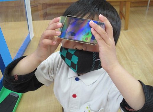 さて、今年から学研の月刊絵本を使用しています。これが、とっても面白い。付録のレインボーカメラをみんなで作って、お友達やお空を見てみたら・・・「うわ~!すごいきれい!!」「不思議な虹になったよ!」と大興奮。