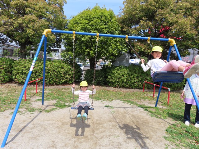 近年、あまり見られなくなったブランコにも挑戦★さすが年長組さんはコツをつかんで気持ちよさそうに揺られていましたよ。ほかにも、新しいお友達と虫探しをしたり、アスレチックを何度も楽しんだり。