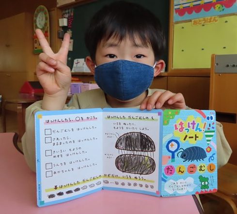 こ~んな『発見ノート(月刊絵本の付録)』にも、自分が発見したダンゴムシの絵を描いたよ。