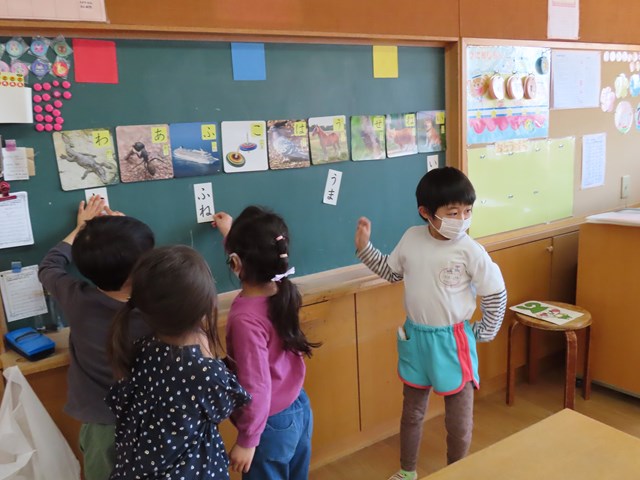 みんなの前に立って、「ふね」「うま」とまずは自分で文字を読み、そのあと、絵に合う文字を貼っていったね。