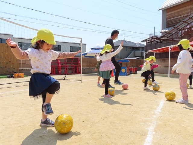 こちらはサッカータイム。3人のコーチと一緒にたくさん練習して、ボールさばきがどんどん上手になっていったよ。