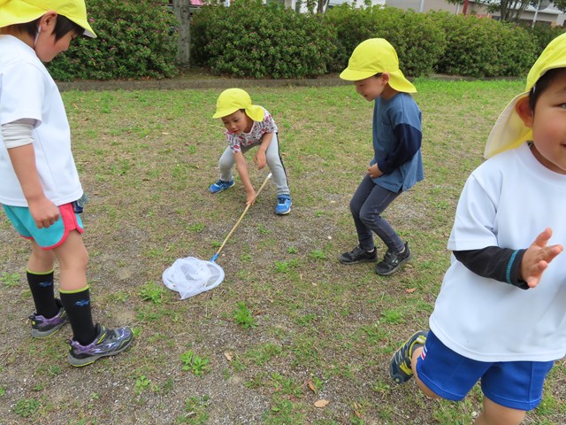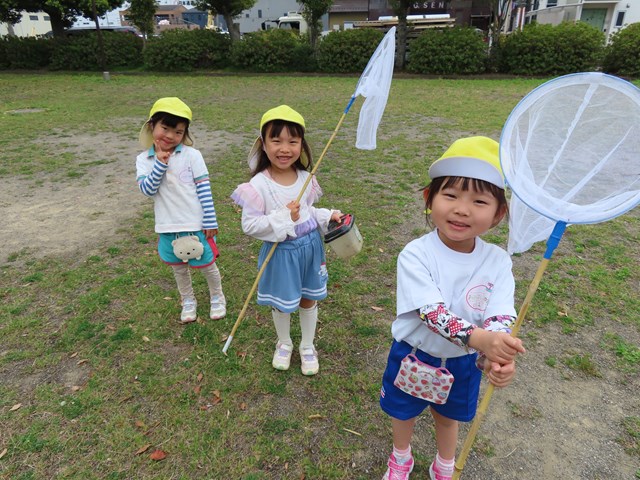 そんな保育の合間に、時間を見つけては、大好きな宇佐中公園に何度も遊びに行ったね。虫取り用のあみも準備して、レッツゴー!さあ、どんな虫がみつかるかな?