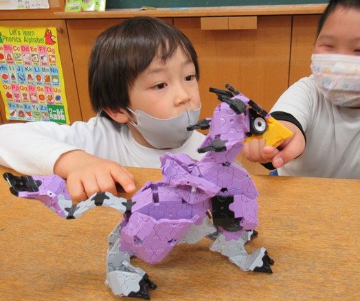 小さなピースをパチリ、パチリと合体させていくと、色々な立体が作れるんですが、子ども達がまだ慣れなくて手探りの状態で遊んでいたところ・・・卒園児の黒田ゆうのすけ君が、自作の作品を、幼稚園の子ども達のお手本に・・・と見せてくれました!