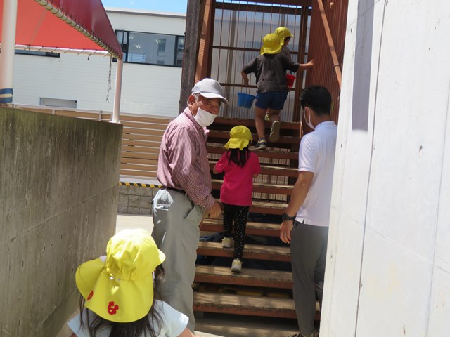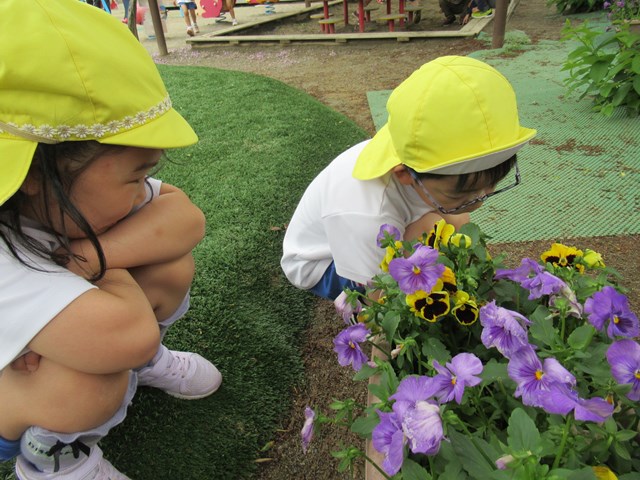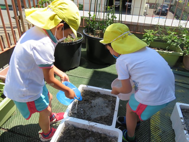 年少組さんたちも、時々見学にきていたね。夏休みの間は、運転手さんや先生たちとで、頑張って水やりをしておくね。子ども達が登園する8月19日からは、また、一緒にお世話をしたいなと思います。