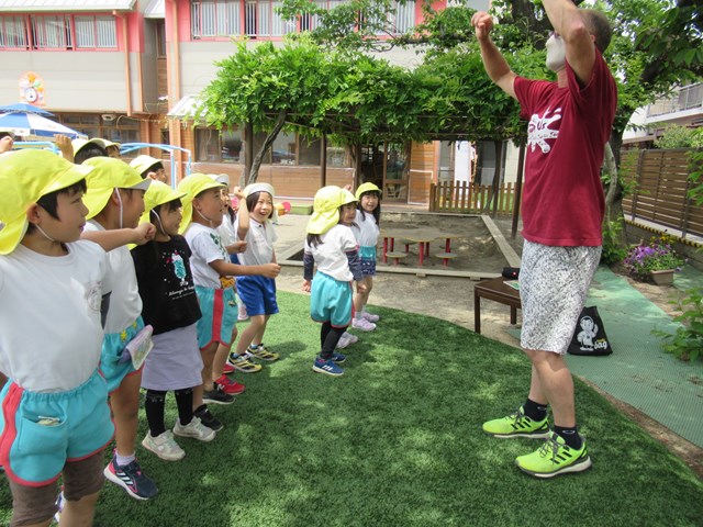 さて、気持ちの良いお天気の日には、園庭でハロークリスを行いました。マスクを外して、おいしい空気をたっぷり吸いながら、英会話を思いっきり楽しんでいたね。