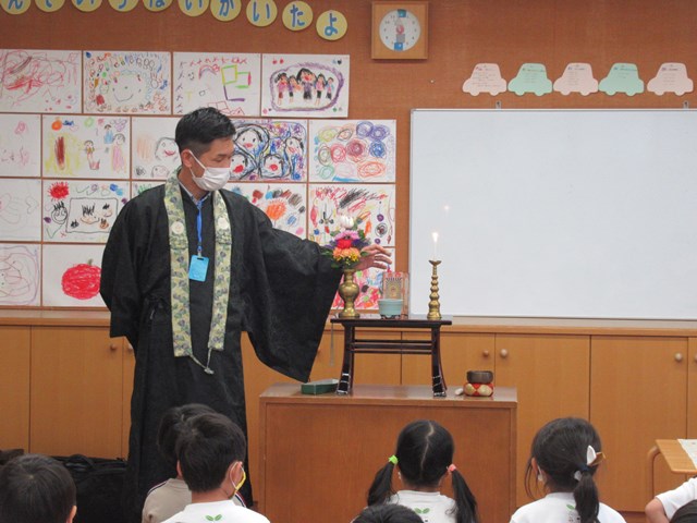 そんな5月半ばには、お釈迦様のお誕生日をお祝いする『花まつり』を行いました。園長先生が、花祭りの由来や、灌仏会について子ども達にわかりやすくお話してくださいました。