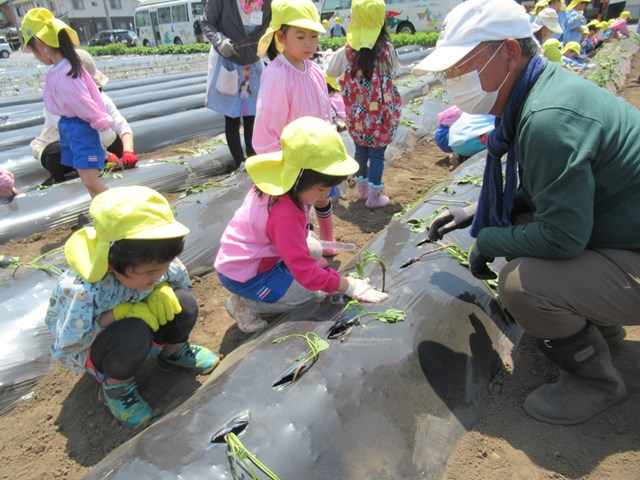 翌日18日は、芋の苗植えに挑戦!!広い畑までバスで向かい、地域の方々に教えて頂きながら芋の苗植えをしたね。苗を植えるコツもすぐに覚えて、一生懸命に取り組んでいました。