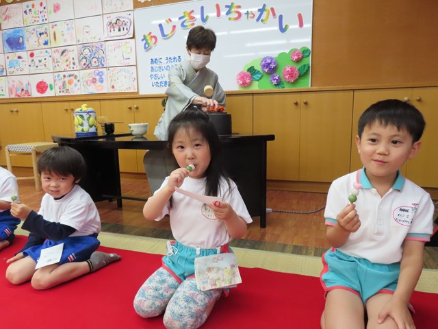 その日には、本物の甘茶も味わったね。「ほんとだ、甘いね」「おいしいね。」これまでに飲んだことのない、不思議な甘いお茶をじっくり味わっていた子ども達。