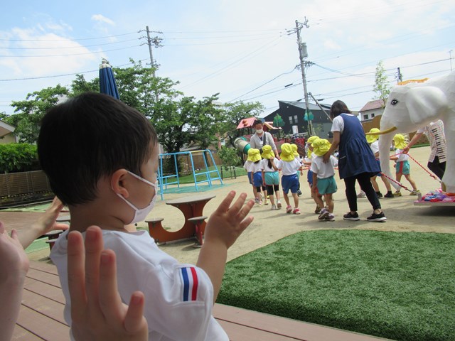 年長組さんが、園庭の中で白い象を引いてるのを見ていた『ちゅうりっぷ組』の小さな子ども達。