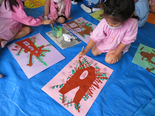 この日も、前回のアートで画用紙を思いのまま切り貼りして作った『木のおうち』に、誰がどんな風に住んでるのかな?と、想像を膨らましながら、思い思いに加筆していきました。