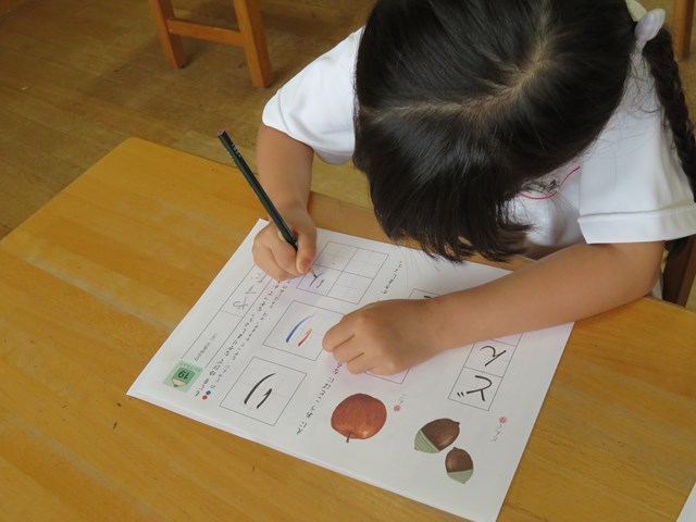 年長組では、濁音や半濁音も学んでいますよ。まず、カードに書いてある文字を、声に出して読んでみようね。