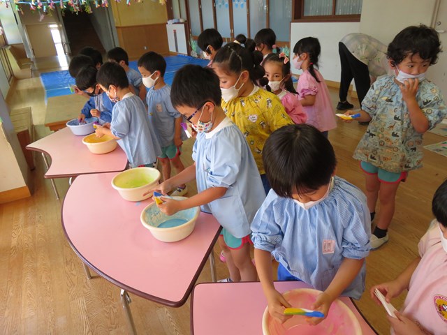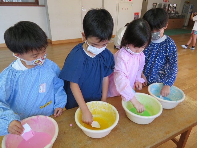 同じころ、年長組さんは染物にもチャレンジしたよ。和紙と絵の具を使って、染めてみたね。
