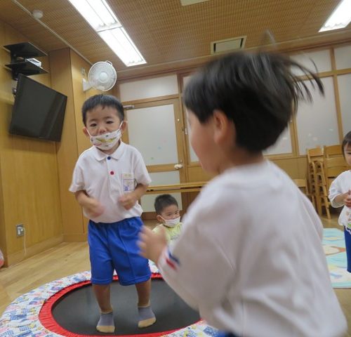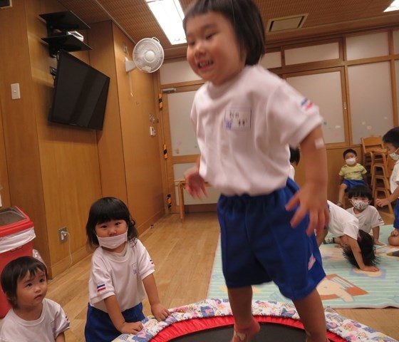 トランポリンを飛んでいるお友達の周りで、見ているお友達もおもわずぴょんぴょん!