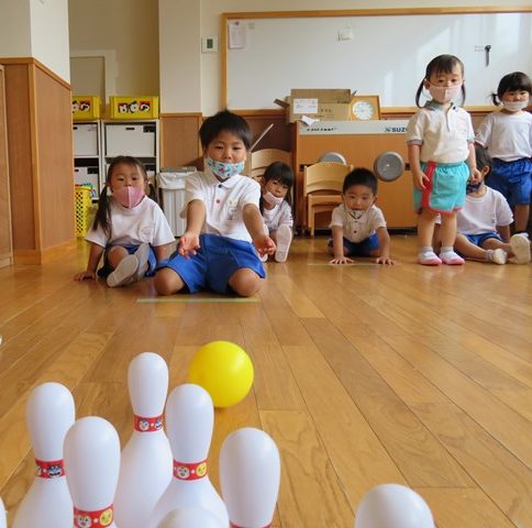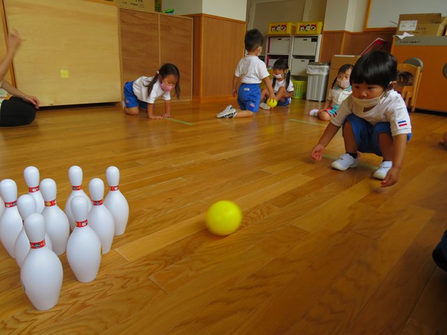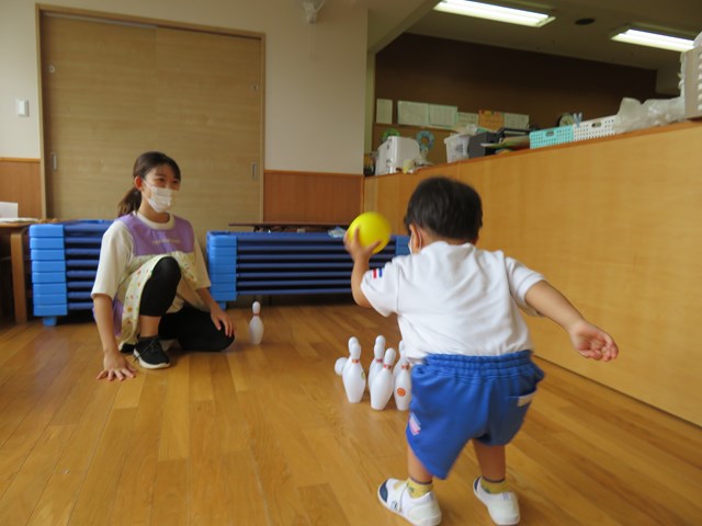 何度も挑戦!ピンが倒れると先生たちから「すご~い!」と拍手に、思わずにこにこ笑顔😊