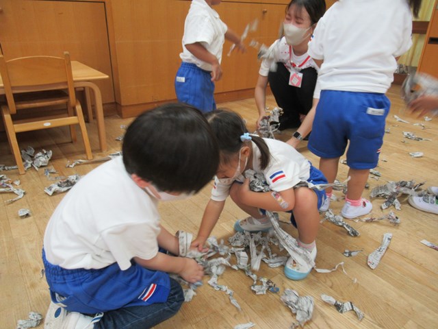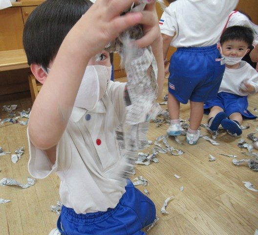 指先をいっぱい使って、破った新聞紙を持って、お友達の上からシャワーを降らせたり、みんなで集めた新聞紙で小さなお山を作ったり。