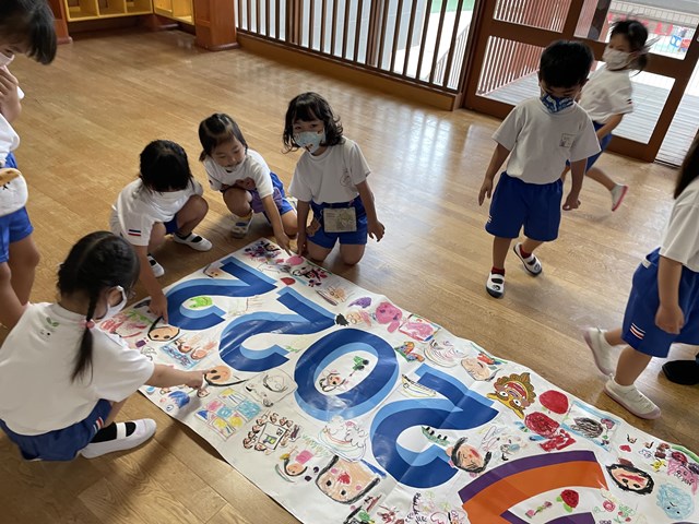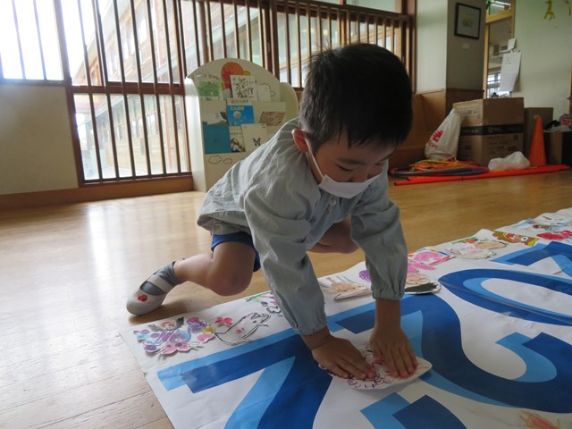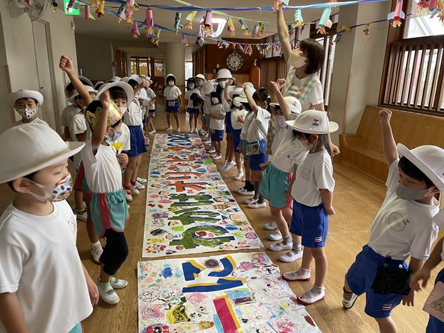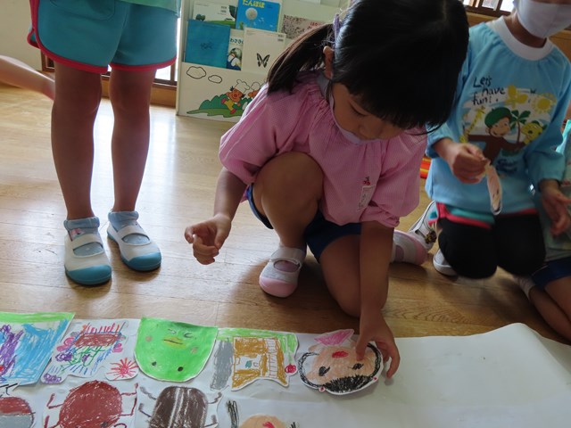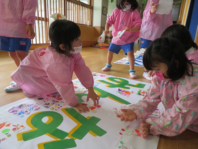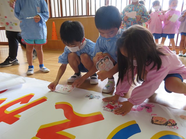 「なんて書いてあるか読めるよ!」年中組と年長組の子ども達が1文字1文字指さしながら、読みました。