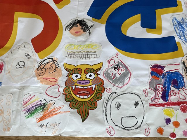 その下には年少組さんが描いた、にぎやかな絵が。もしかして、みんなでダンスをしてるところかな?