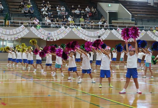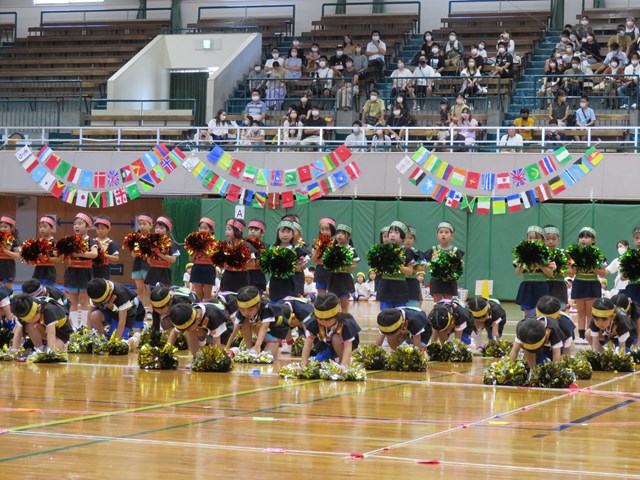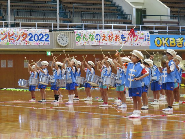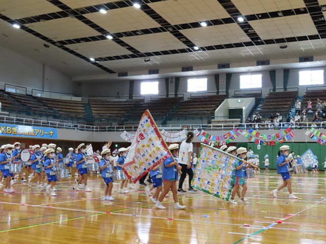 水色の鼓笛の衣装に白いベレー帽子がとっても似合っていたよ。短い期間だったけれど一生懸命に練習してきたね。お互いの音を聞き合い、みんなの心が一つになった素晴らしい演奏でした。アリーナいっぱいに響き渡るドラムマーチは、みんなのパワーそのもの。退場も、最後まで立派な姿でした。