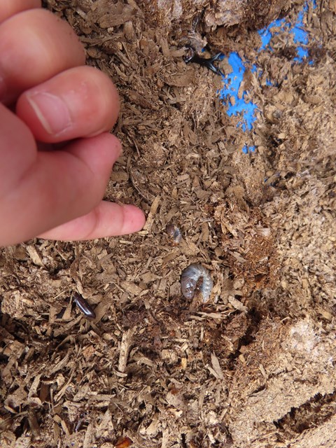 虫ケースに新しい腐葉土をいれて、幼虫を入れてみると・・・幼虫が動き出しました。