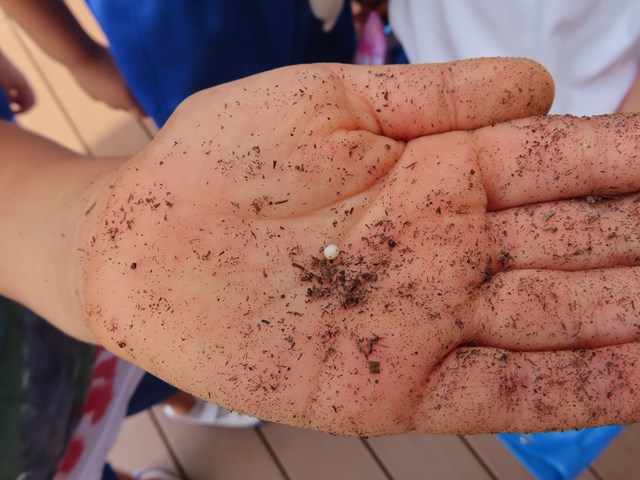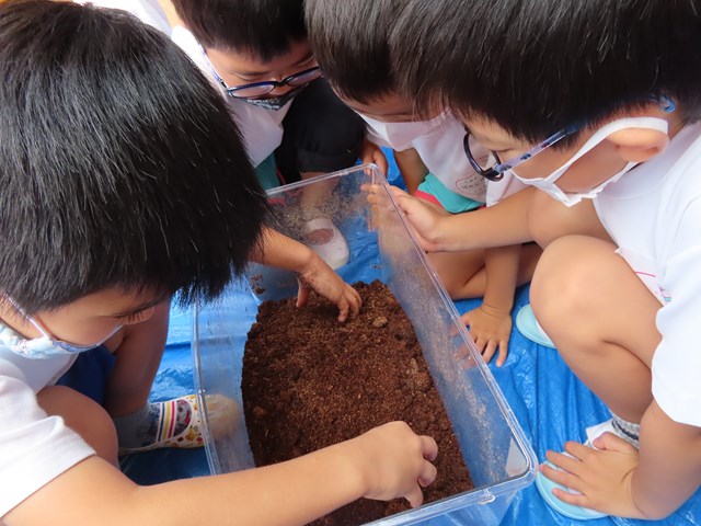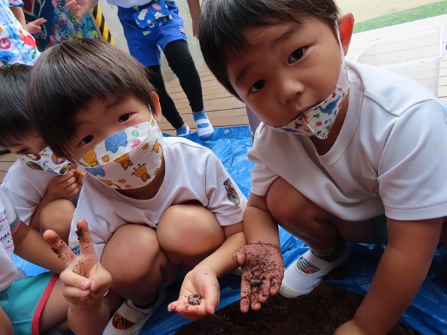 早速、9月20日に、年長組のみんなでブルーシートの上に土をひっくり返してみました。すると・・・