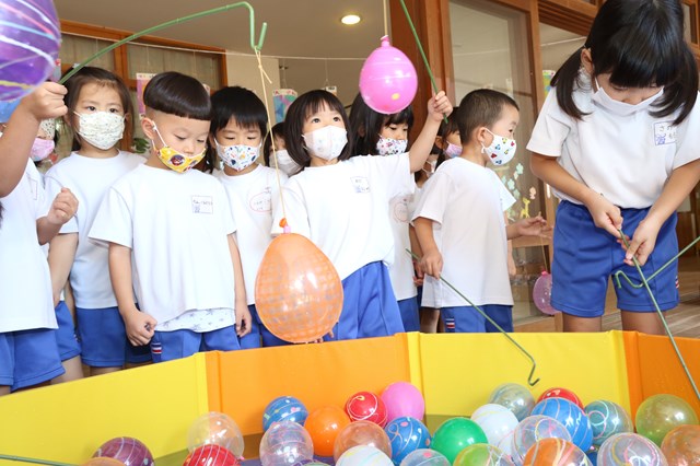 「やった!取れた」欲しかった色の風船が竿の先でゆ~らゆら。
