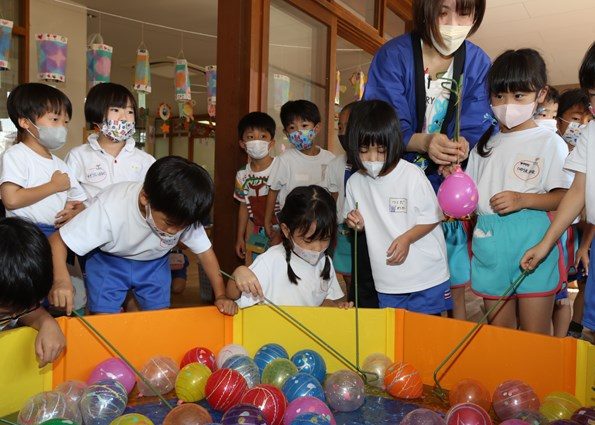 子ども達は、盆踊りや水風船釣り、そしてお店屋さんでのお買い物を思いっきり楽しみました。