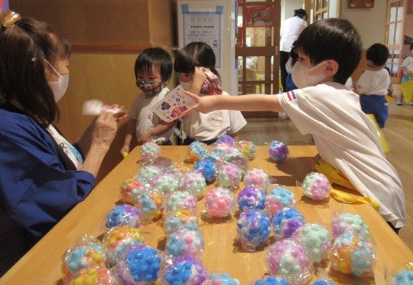 お買物券を店員さんに「はい!」と渡して、「これ」と自分の欲しい色のかわいいボールをGET😊大切そうに手にもっていた子ども達。