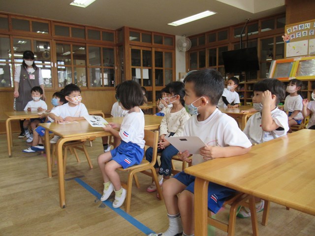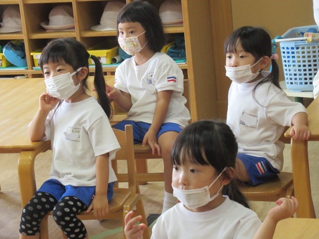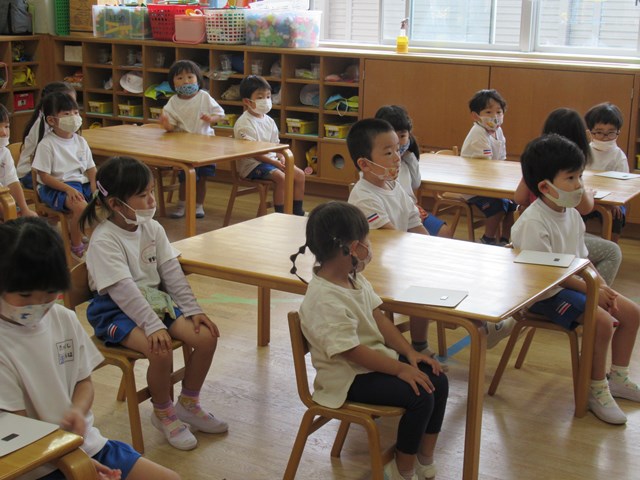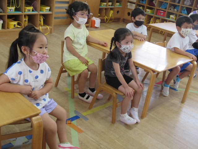 10月5日(水)の年少組さんたちはちょっぴり緊張気味。でも、背筋がぴんと伸びて、とってもかっこいいですね😊