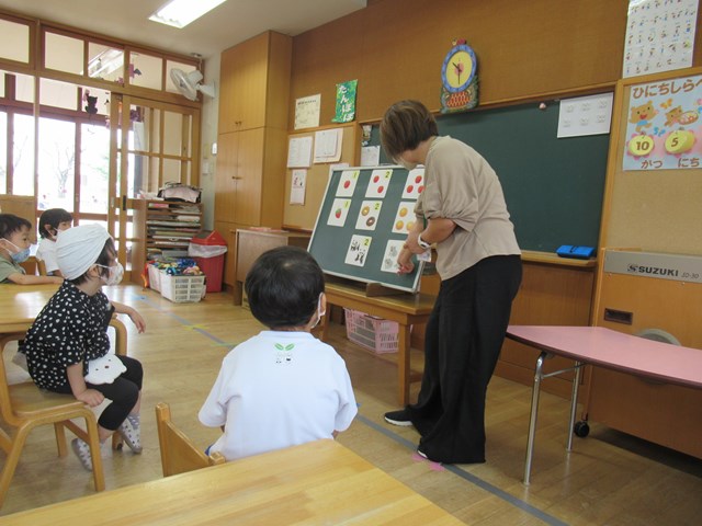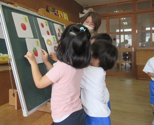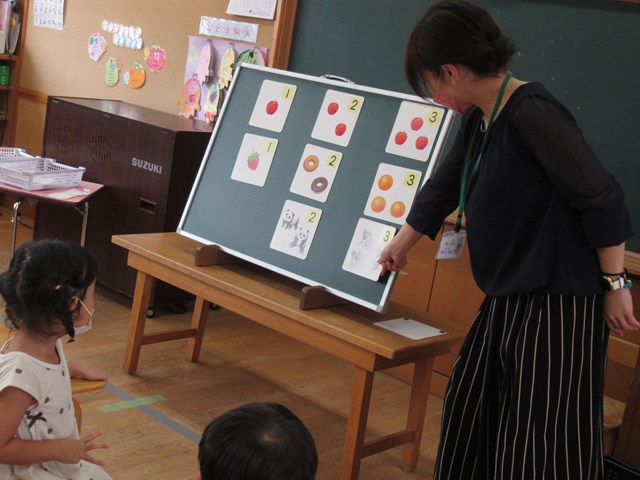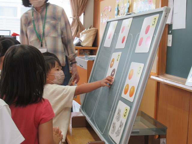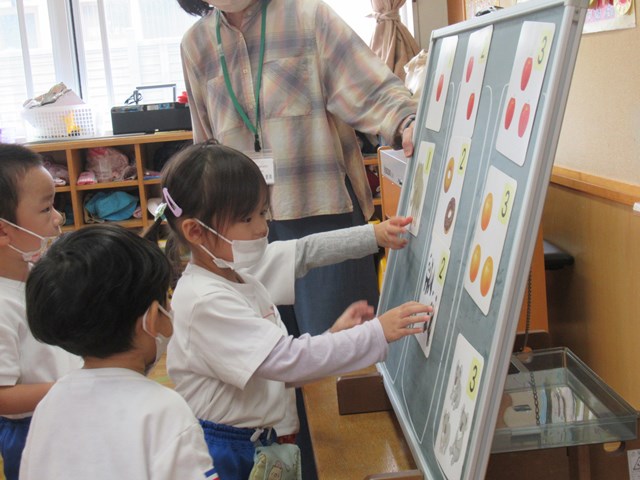 「これ、知ってる~!」とやる気満々で数を声に出して読んだり、指を出して数えていた子も。次から次に、みかんやリンゴの絵が並べられていきましたよ。