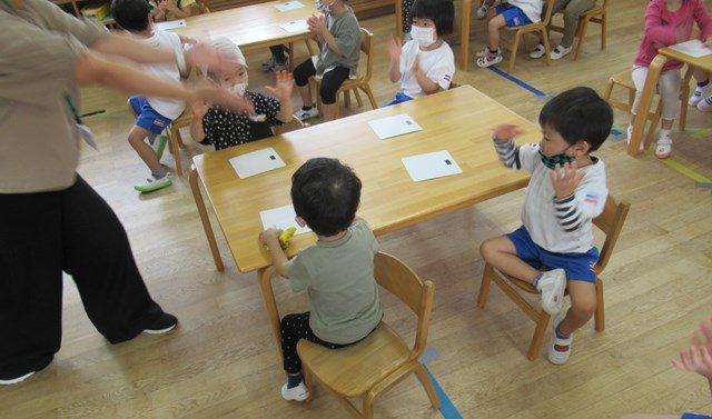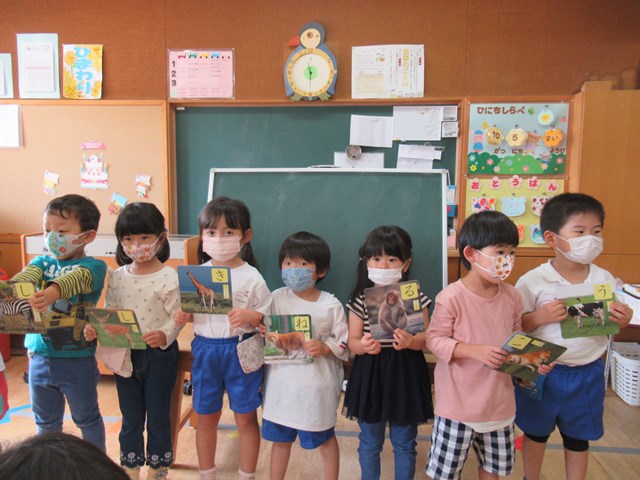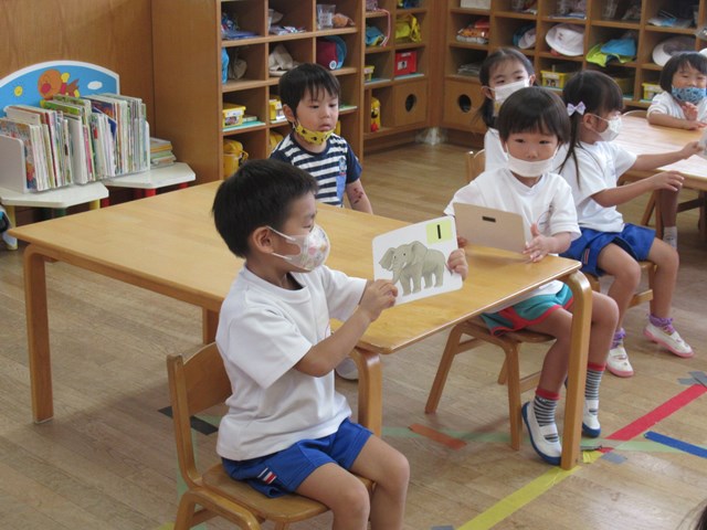 先生が配ってくれたカードを見ながら、お友達と「ぼくはぞうさん」「ぼくはね・・・」