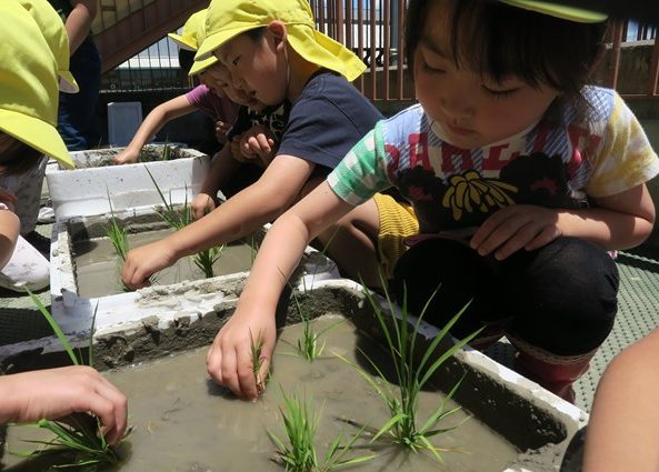 6月に『お米作りプロジェクト』が始動し、年長組のみんなで田植えの土づくりから始めました。