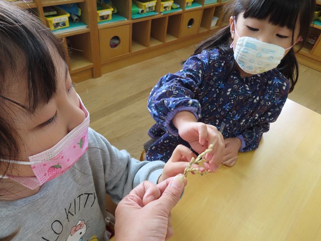 そして、翌日の27日には幼稚園のみんなでお米を一粒一粒バラバラにする作業をしました。小さな指を使ってみんな黙々とお手伝いしてくれましたよ😊