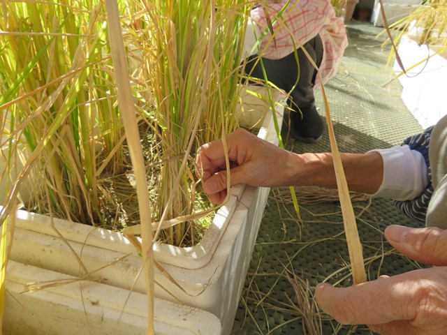 収穫の前日には、子ども達が稲刈りがしやすいように、先生たちが麻ひもで稲を分けて結びました。