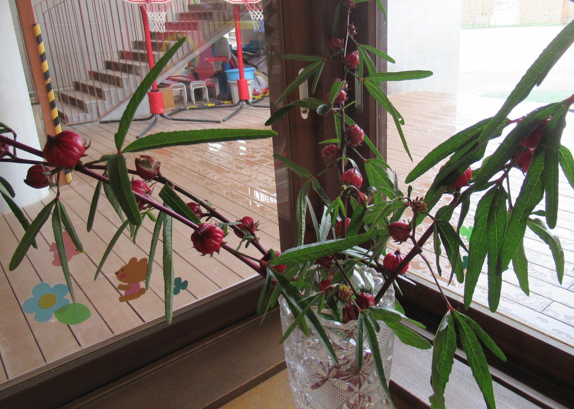 こちらは、園長先生が持ってきてくださったローゼルの花。硬くて真っ赤なお花が、幼稚園を秋の雰囲気に色付けてくれました。このローゼルからも種が取れましたよ。