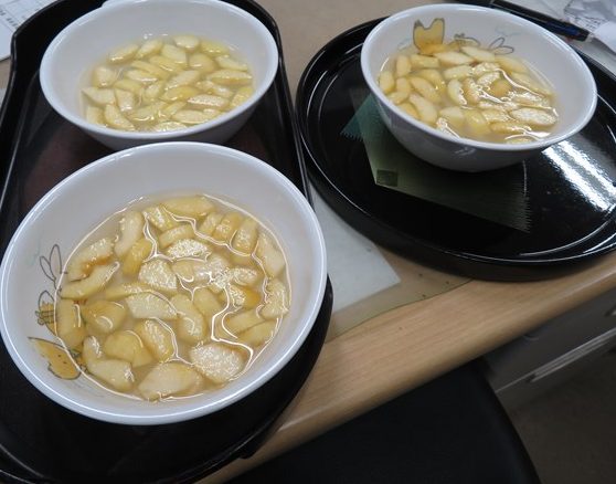 そこで、教務課の疋田先生が一生懸命皮をむいて、小さく切り分けてくれました。